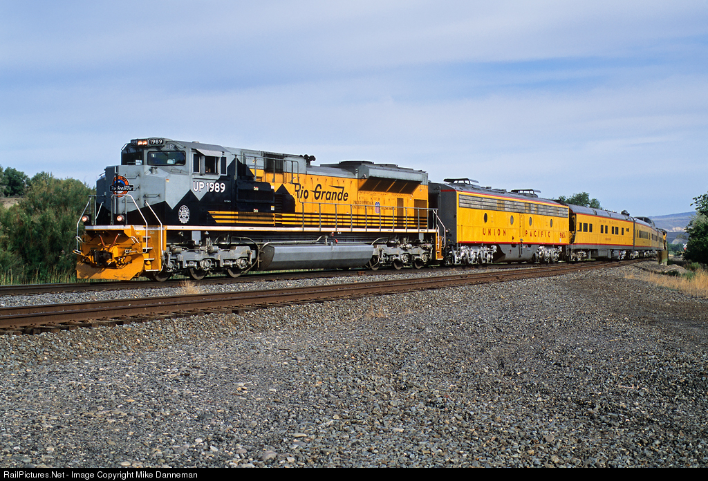 Union Pacific EMD SD70ACe No. 1989, the Rio Grande heritage locomotive, leads a UP Operation Lifesaver special at Delta, Colorado, on June 14, 2009. Behind No. 1989 is UP E9B No. 963B, and on the other end of the four-car special is GE AC4400CW No. 7250 used as lead locomotive on westbound trips.