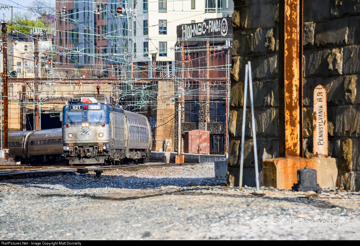 The 921 brings a Northeast Regional out of Union Tunnel approaching Penn Station, and off to the right the sun illuminates the survey marker proudly displaying "Pennsylvania RR" on one side and "Union Railroad" on the other. Time seemed to have happily forgotten about this ancient piece of railroad history, safely tucked away between the catenary pole and bridge abutment, until it went missing in late 2017.