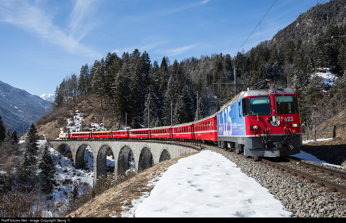 | Ge 4/4 II # 623 in the blue paint scheme for "125 years Rhaetian Railway 1889 to 2014" is pulling Interregio 1133 from Chur to St.Moritz over the 35 meter high Schmittentobel viaduct near Filisur. Typical for the RhB is a freight car in the rear of a regular passenger train. |