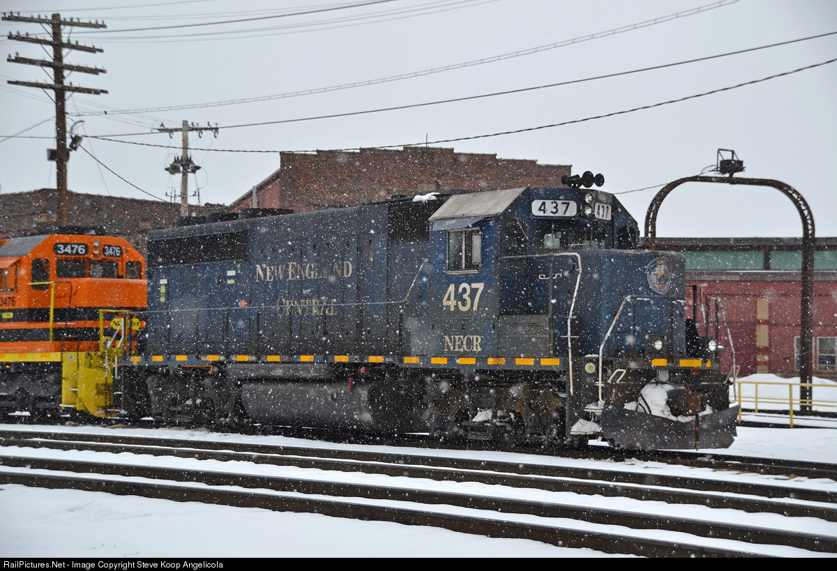 | Not orange yet, NECR 437 is still wearing it's old New England Central paint as it awaits it's next assignment during a Vermont snow squall. |