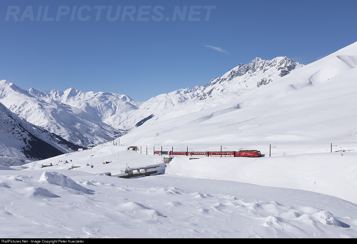 | On a quite perfect day regional train 828 from Andermatt to Disentis is climbing out of the Urseren valley up to the 2044m (6706ft) high Oberalppass. This is done through the help of a cograil. Even if it is early march the landscape is covered with a fresh layer of snow. On the Oberalppass itself the sow height is somewhere in between 1 and 2 meters, so parts of the train are shadowed by the snow walls. The line was closed for some days during the winter due to the amount of snow and following avalanches. |