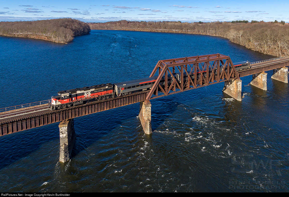 As the Connecticut Department of Transportation gears up for the May 2018 launch of the new Hartford Line service, test trains were launched this weekend with borrowed Shore Line East equipment from CDOT. Test 6696 south is seen crossing the Connecticut River at Suffield, Connecticut on Sunday afternoon, March 11, with one of the two remaining GP40-2H locos in this particular scheme.