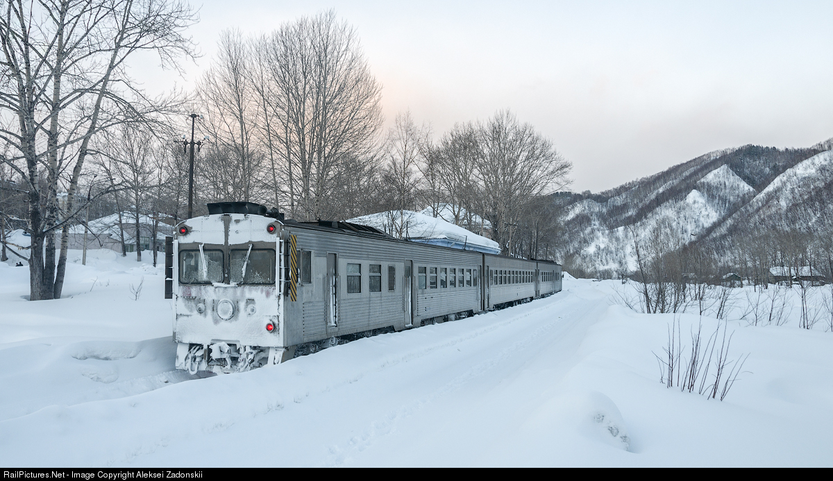 D2-008 DMU train at the endpoint Bykov station of the dead-end branch from Sokol to Bykov. Now Bykov is a village and now in this railway line there is only a local train to Yuzhno-Sakhalinsk (which is on this photo) but in the past Bykov was a coal mining town. D2 were manufactured in 1985 by Fuji Heavy Industries (Japan) for Soviet Union for use on a Sakhalin railway with a track gauge of 1067 mm (as in Japan). The Sakhalin railway was mainly built by the Japanese according to their standards using the labor of Korean workers when the southern part of Sakhalin (south of the 50th parallel) belonged to Japan and named Karafuto (between 1905 and 1945). A consequence of this is the difference in gauge on the Sakhalin island from the continental part of Russia, but since 2003 JSC "Russian Railways" is working on a replacement the gauge to Russian 1520 mm. The most ambitious work is planned for this year and completion of all work is scheduled for 2020.