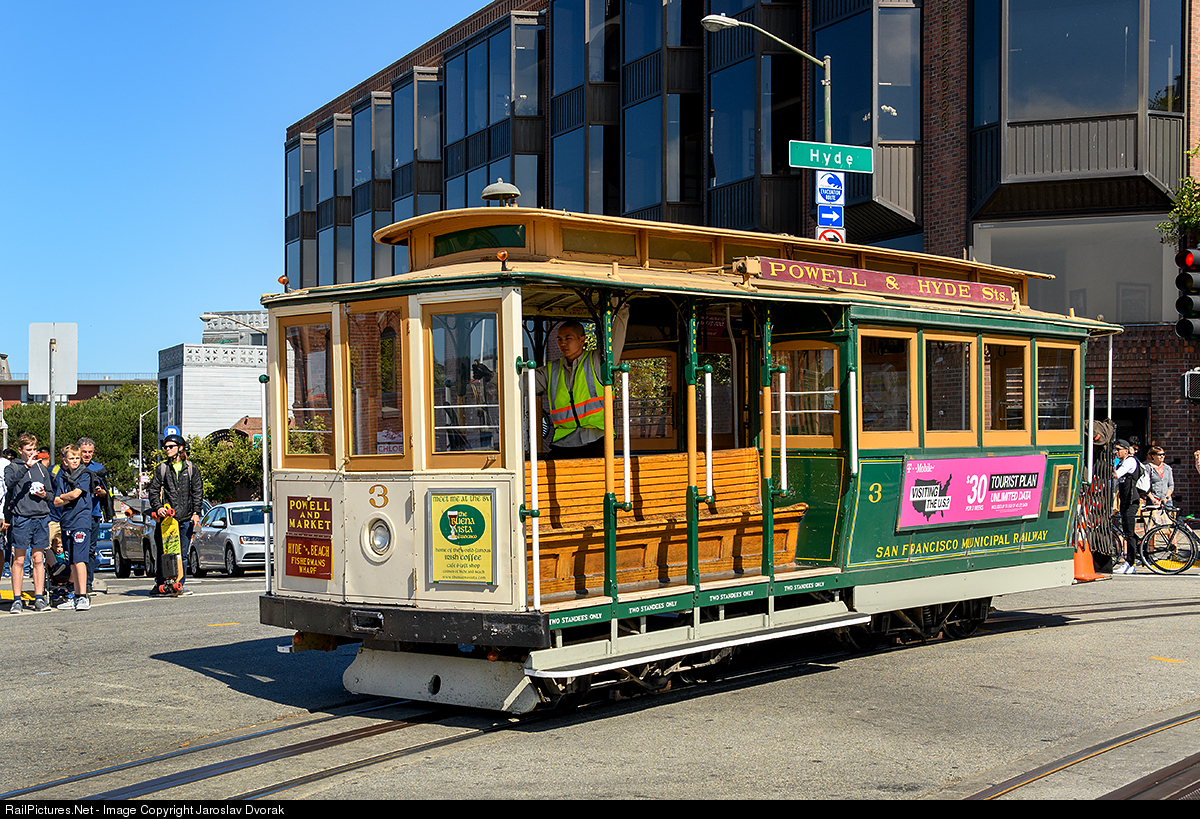 MUNI`s Cable Car # 3 was captured on the Powell-Hyde track. Cable Car is one of San Francisco's indispensable symbols - annually by about seven million passengers.