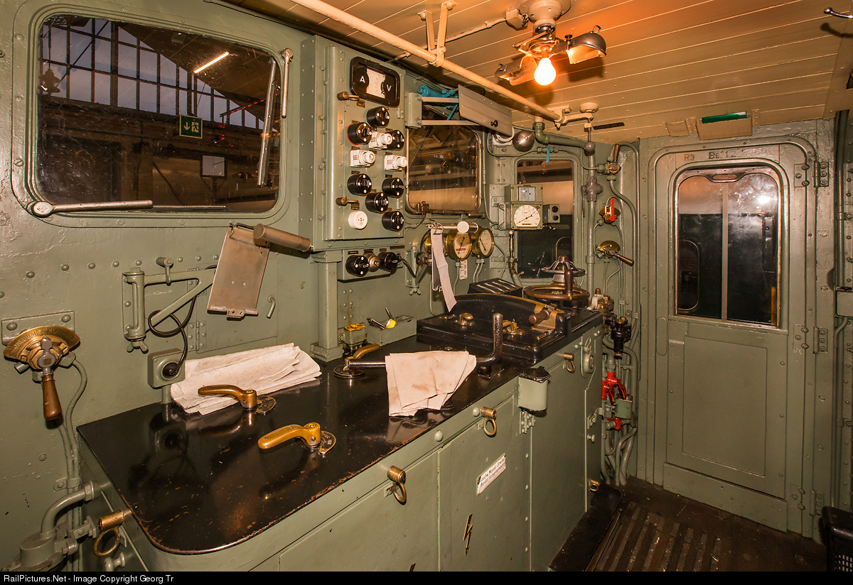 | In the cab of "crocodile" Ce 6/8 III # 14305 of SBB Historic during a visit in the depot Olten. The locomotive was delivered in 1926 by SLM and MFO to the SBB and run on the Gotthard line for decades, later on lines with less heavy grades. It became historic locomotive in 1976. The place of the engineer is on the right side. |