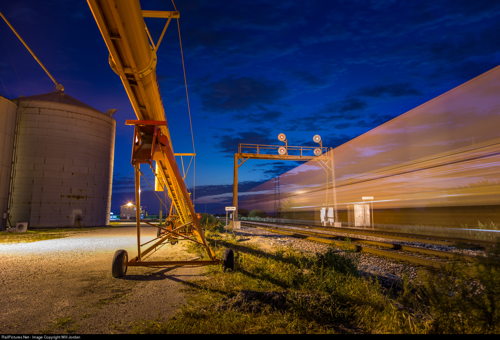 The first hint of daylight begins to show itself over the vast farmlands of northern Illinois as an eastbound stack train takes a clear signal at Ancona on the former Santa Fe Transcon. The landmark AT&SF searchlights here have since been removed from service and fallen to new, standardized technology, making this, now, a boring stretch of railroad. The farm equipment in the foreground and silos to the far left are most appropriate for this region of the United States where agriculture is king.