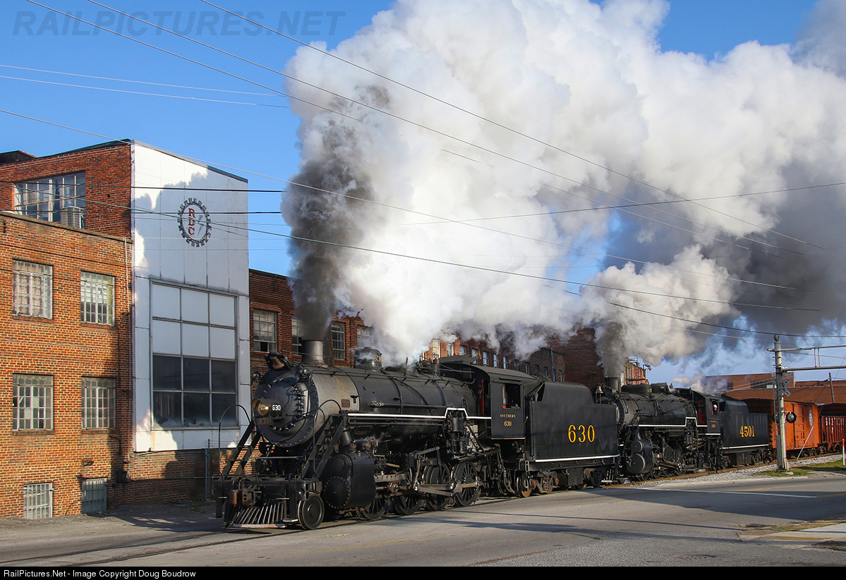 | Southern #630 and #4501 lead a mixed freight past the former textile mills in Rossville, GA during the March 2018 Lerro Productions photo charter held in conjunction with the Tennesse Valley Railroad Museum |