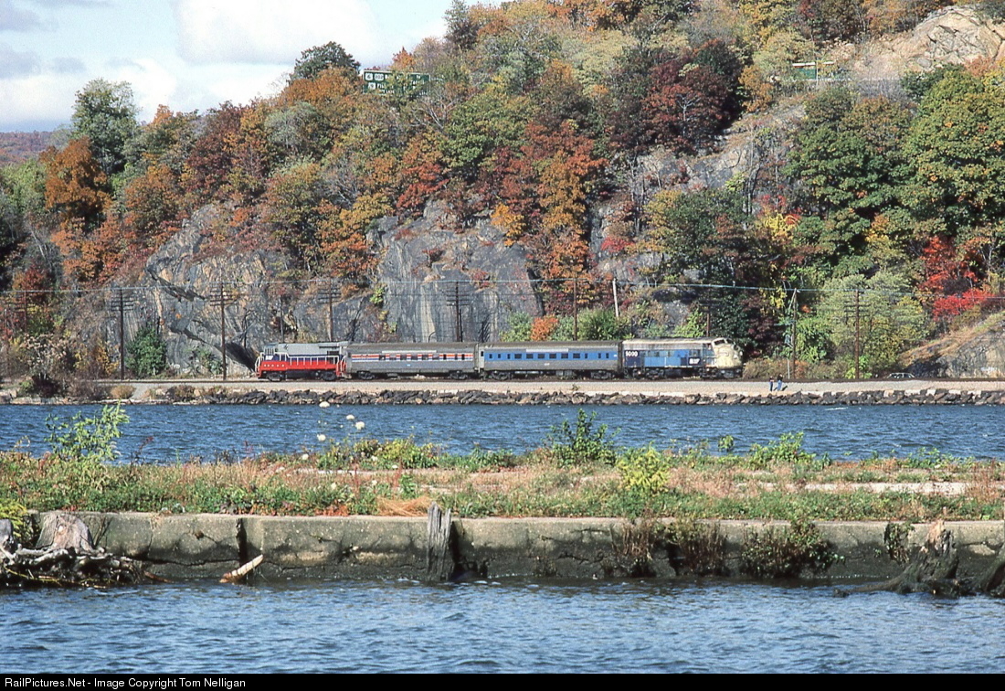 Autumn color has come to the Hudson Valley as a southbound Metro North Poughkeepsie shuttle cruises along the river at Peekskill on its way to Croton-Harmon. The consist of two diesels, in this case an FL9 and a GE B23-7, bracketing a pair of former long distance coaches was the usual makeup for these trains at the time. FL9 5000, formerly New Haven 2000, was the first of the fleet.