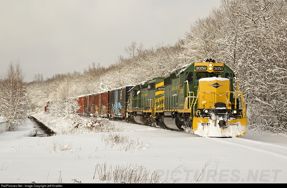 | Dashing through the snow is Reading and Northern's West Hazleton "Fast Freight" headed by SD40-2 #3050. The train is climbing up the former Lehigh Valley branch through McAdoo, PA. A short distance ahead, the engineer will take the train down the mountain to Tamaqua with the deep snow adding some extra work to his descent. |