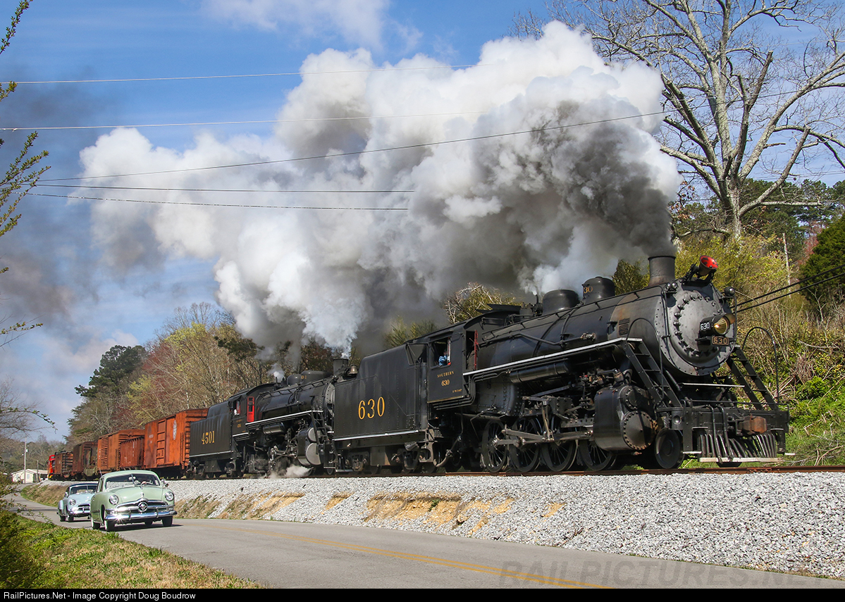 | The Southern Railways doubleheader steam train passes through Fairview, Georgia near the Chickamauga and Chattanooga National Military Park. This was the site of a bloody 1863 American Civil War Battle where Union and Confederate troops were fighting for Chattanooga, a major rail hub. The antique cars added to the scene and were staged as part of the March 2018 Lerro Productions event. |