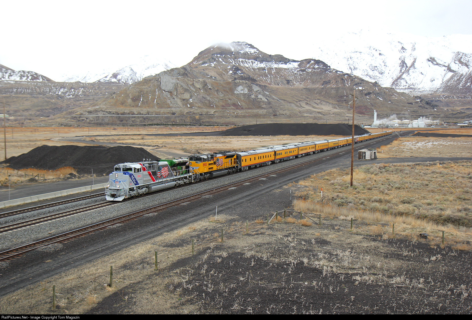 UP put a little green for St Patrick's Day on the point of this 20 car passenger car in the form of camouflage. The "Spirit of Union Pacific" leads the train in and out of a snow storm at Garfield enroute to Ogden Utah.