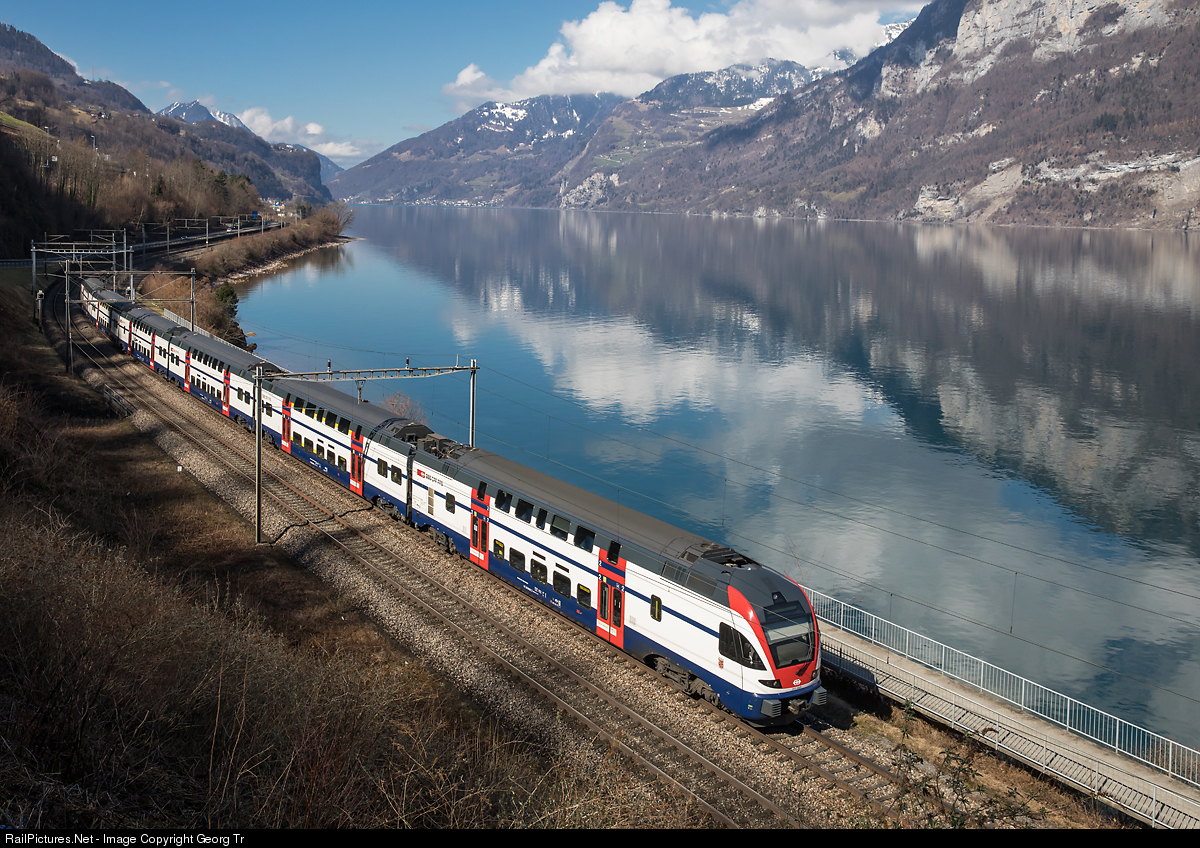 | Stadler "KISS" doubledeck train RABe 511 # 033 in the S-Bahn Zürich paint scheme (white/blue) is running the Regio Express 5067 from Zürich to Chur along the shore of the Walensee near Murg. |