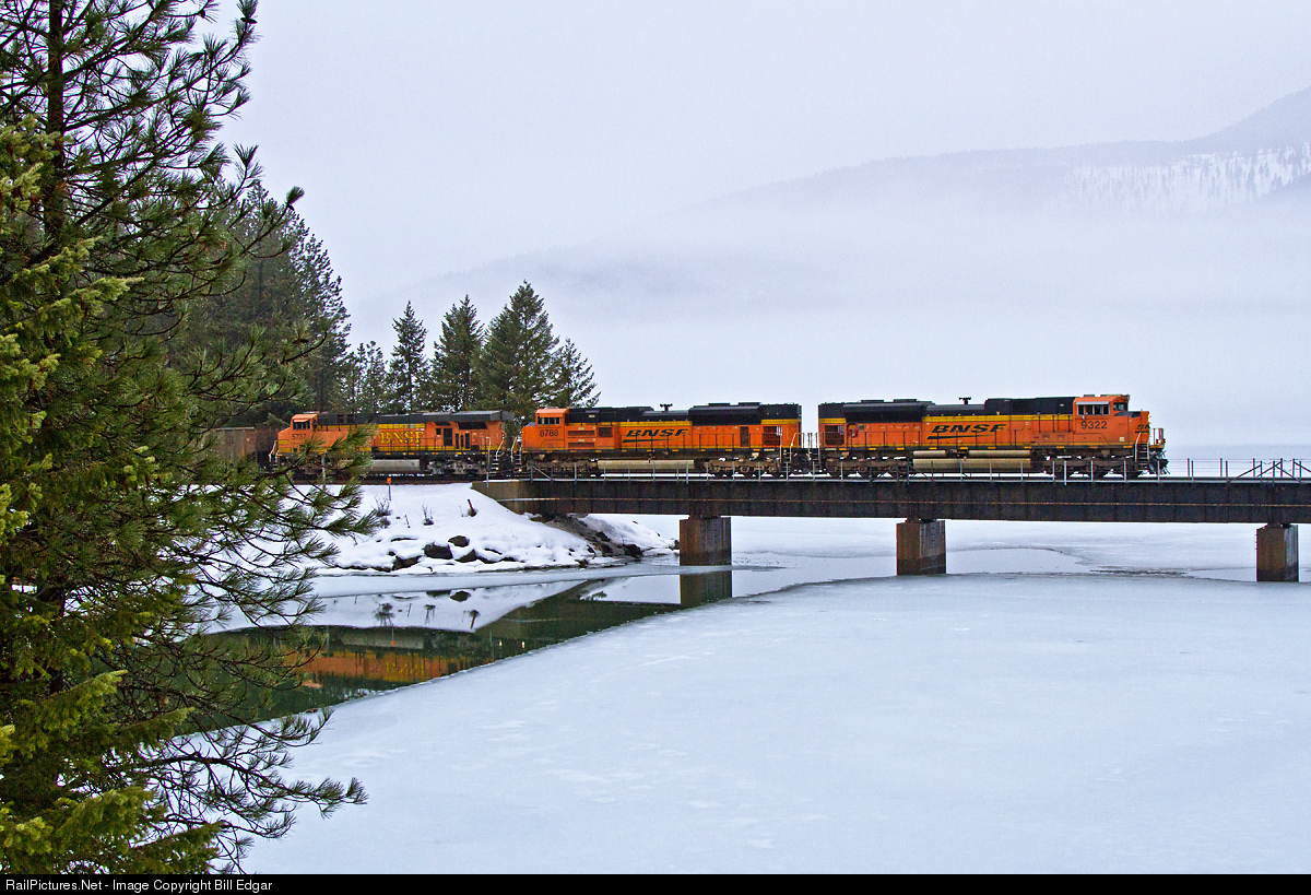 | BNSF 9322 rolls a westbound coal train over the bridge just past the west end of Tuscor siding on Montana Rail Link near Trout Creek, MT. Fog lifts off the Clark Fork in the background. |