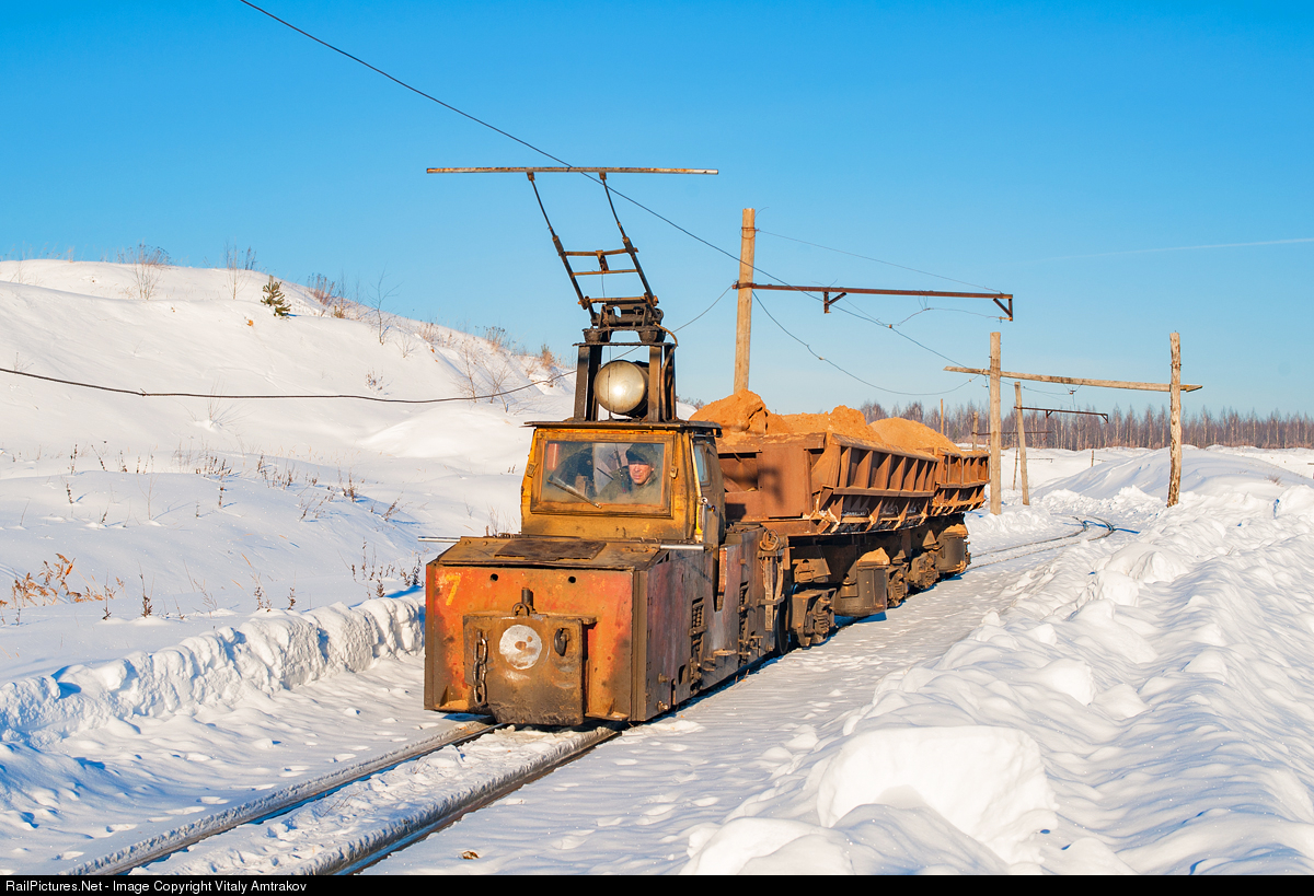 Narrow gauge electric loco K14M-7 is pulling two gondola cars with sand.