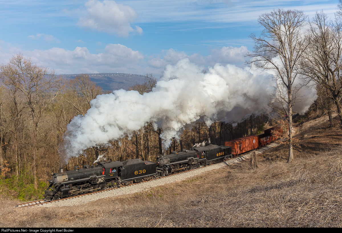 Southern Consolidation #630 (built by ALCO in 1904) and Mikado #4501 (built by Baldwin in 1911), leading a mixed freight train, put on a great show near Rossville, GA! In the background Chattanooga's Lookout Mountain can be seen. A great Lerro Productions charter together with the Tennessee Valley Railroad Museum.