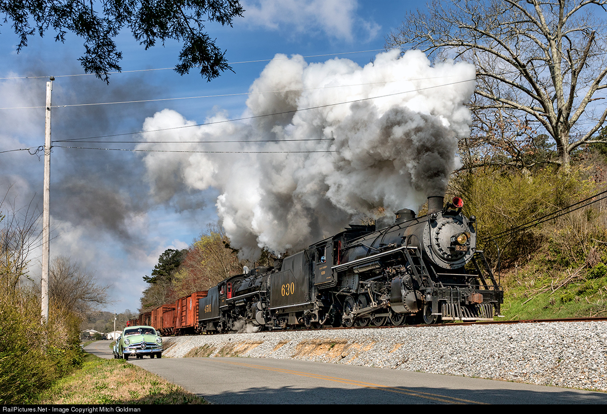 | A Southern Railway double header (Southern No. 630 leading No. 4501) roars south through Fairview, GA on the Central of Georgia's Chattanooga Rome & Columbus (CR&C) route to Summerville. This scene, part of a Lerro Productions charter is captured at Lytle Rd crossing near the Chickamauga Battlefield. No matter how many times we staged this, we could not help but end up with a car in the scene! |