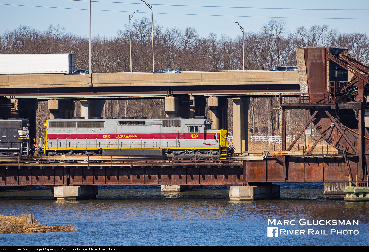 Chemicals up the coast. Norfolk Southern Corp 1700 (EL heritage, ex-Conrail 6654, ex-EL 3669, SD45-2) is on the move over the bridge at CP Karen in Carteret, New Jersey on Sunday, March 18, 2018. As PR32 out of Port Reading Yard, it will head to Oak Island Yard to exchange its load for other cars before returning. This is a true “heritage” unit, having been returned to a paint scheme nearly identical to when it was delivered.