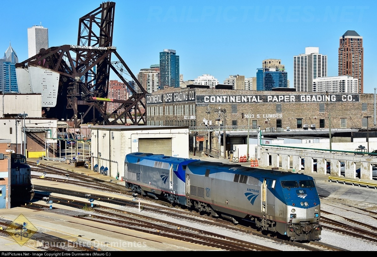 In the city of the winds, is reached see part of the skyline. GE P42DC Amtrak units at Chicago's 18th Street Amtrak locomotives facility, with St. Charles Air Line bridge, and old CPG Continental Paper Grading Co. headquarters built in 1919, in background. Always, nice and interesting panorama for any visitor, especially who like trains.