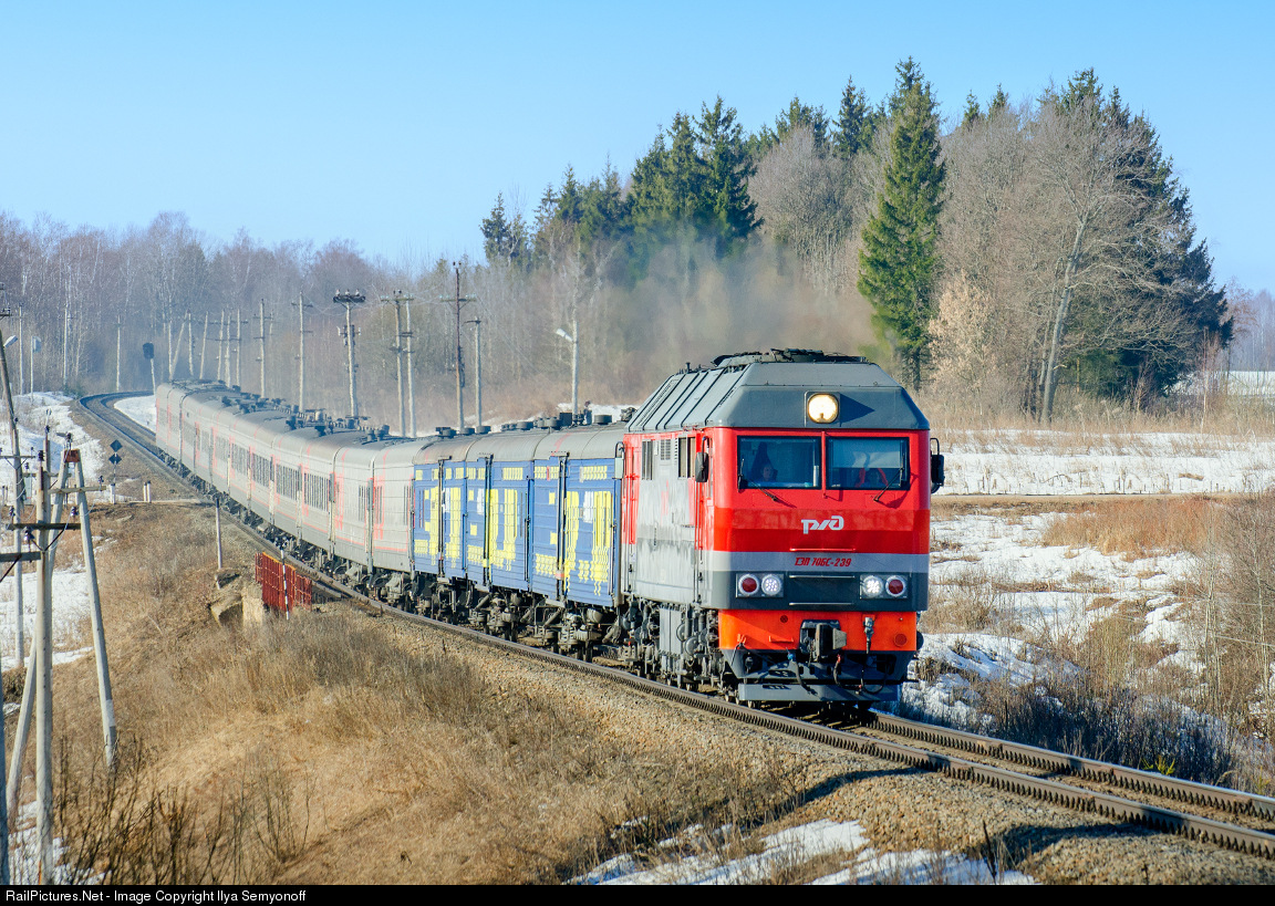 TEP70BS diesel locomotive with Propaganda train of Liberal Democratic Party of Russia (LDPR) near Staritsa station. LDPR propaganda train rides a journey to remote places and stations of Russia as part of the elections campaign to the Russian State Duma.