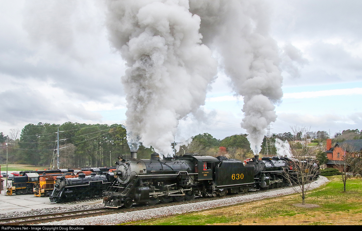 | The 1904 American Locomotive Works Consolidation #630 and the 1911 Baldwin Locomotive Works Mikado #4501 pulla freight train into the wye at Grand Junction during the March 2018 Lerro Productions photo event. Also in the photo is the 1919 Montreal Locotoives Works 4-6-2 #5288. This engine served the Canadian National and has been on static display at the TVRM since 2001. Further to the left is a variety of TVRM owned diesel equipment. |