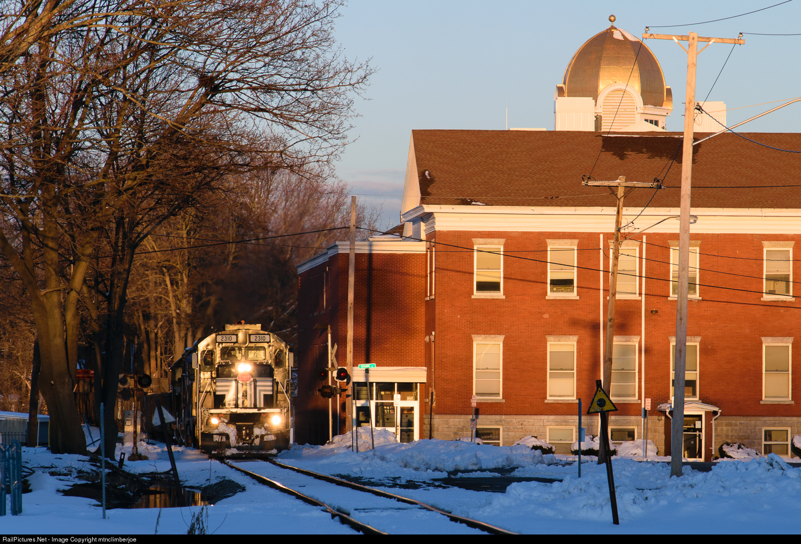 In the last golden rays of sunlight, the Finger Lakes GS-2 belches smoke as it passes by the court house in Waterloo, NY.