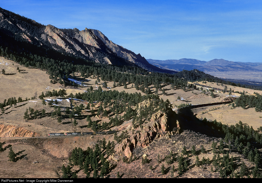 An eastbound Union Pacific coal train led by a pair of Southern Pacific AC4400CWs threads Tunnel 1 at Plainview, Colorado, on New Year’s Eve 1997. The rear of the train can be seen passing Plain siding on the right in this view looking toward the unique Flatiron rock formations above the city of Boulder.