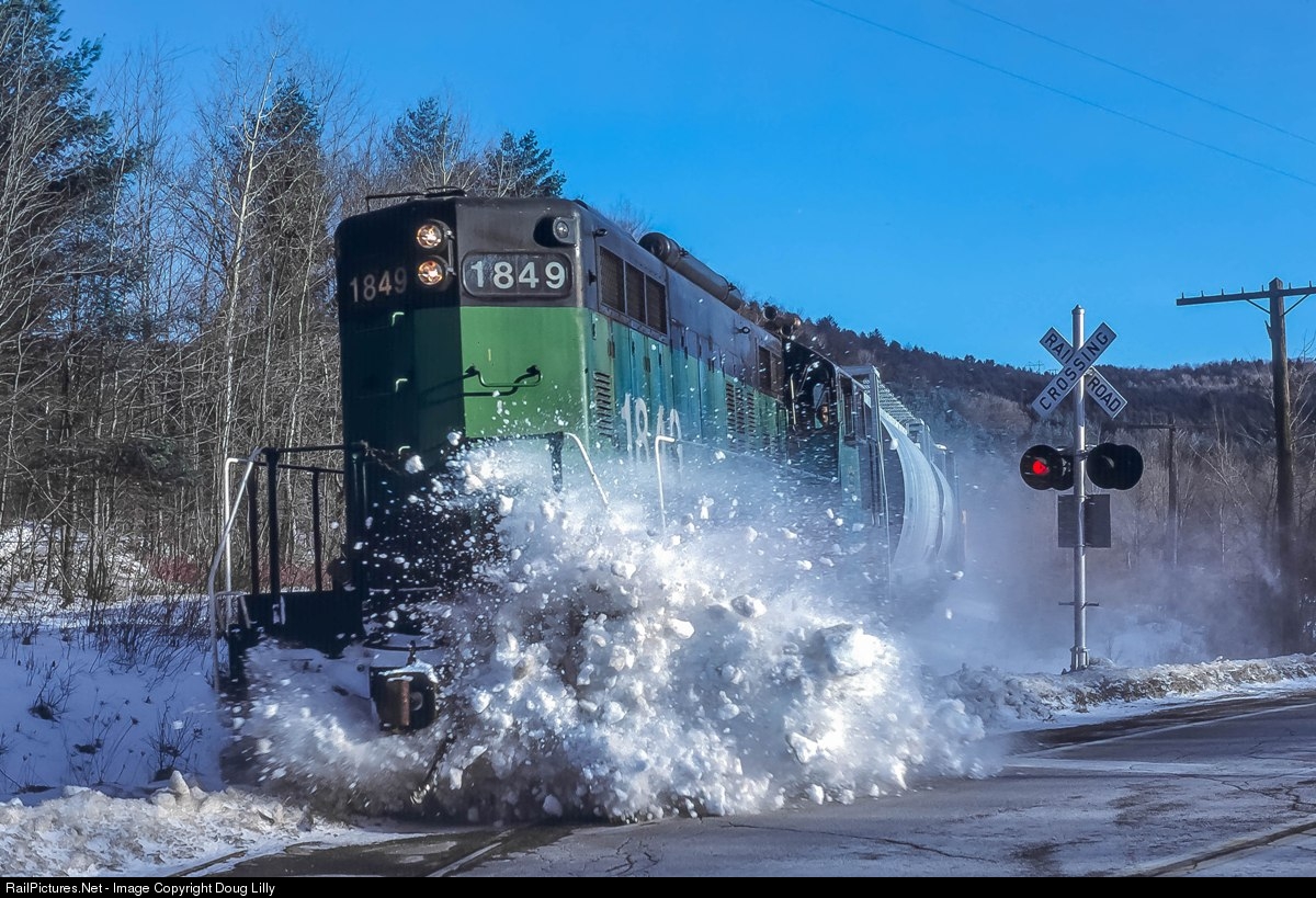 On a winter trip to Vermont, we headed east from Rutland in hopes of intercepting the Green Mountain train coming from Bellows Falls. We made it to Spring Lake, where a distant headlight indicated we should set up for a shot. Wanting to take advantage of the snow on the ground., we chase an atypical (for us) grade crossing shot to get the train bucking some of the white powder. As the train came into view, the anticipated GMRC RS1 was actually a recently-acquired patched BN GP9, which stung a little. And then there were the chunks of packed snow/ice that the EMD launched in our direction. They stung a little more.