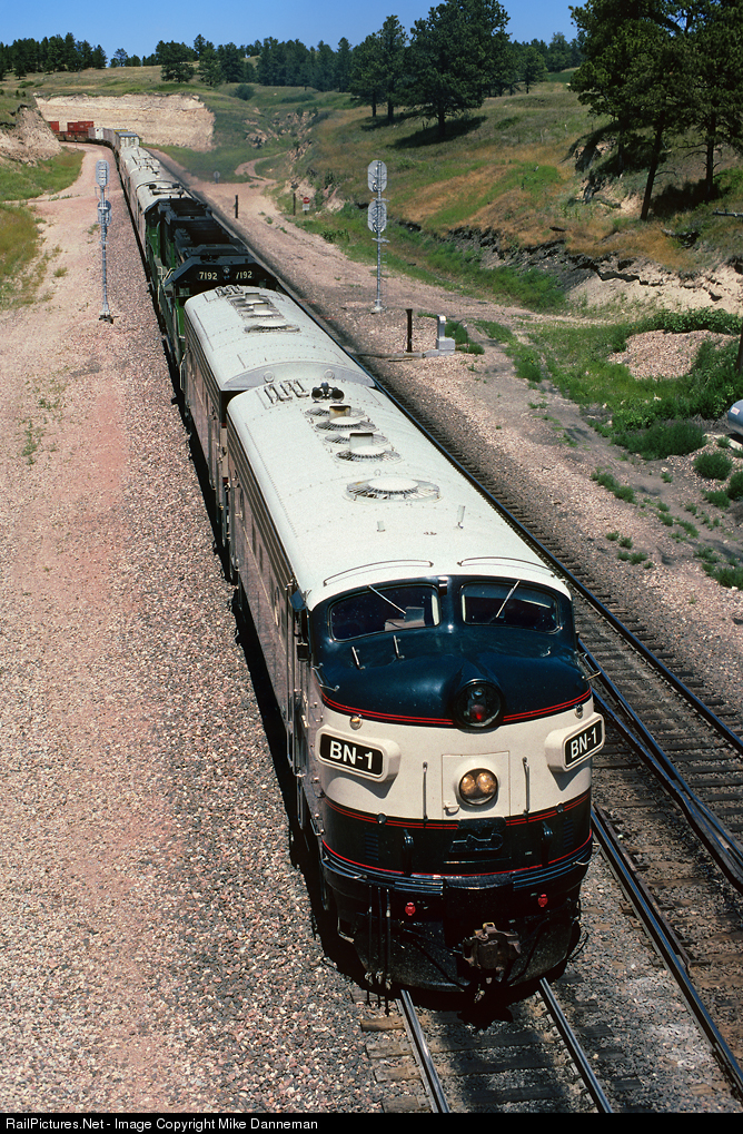 F units on Crawford A rare treat among all of the coal trains, Burlington Northern EMD F9A-2 No. BN-1 crests the top of Crawford Hill at Belmont, Nebraska, on the point of an eastbound intermodal train on July 9, 1994. Behind BN-1 is F9B-2 No. BN-2 and two SD40-2s, that are on the drawbar of five of BN’s business cars up front in the train. Both of the F units were rebuilt in 1990, and are painted in Grinstein colors—but in a railroad environment, I’m not sure about that white roof!