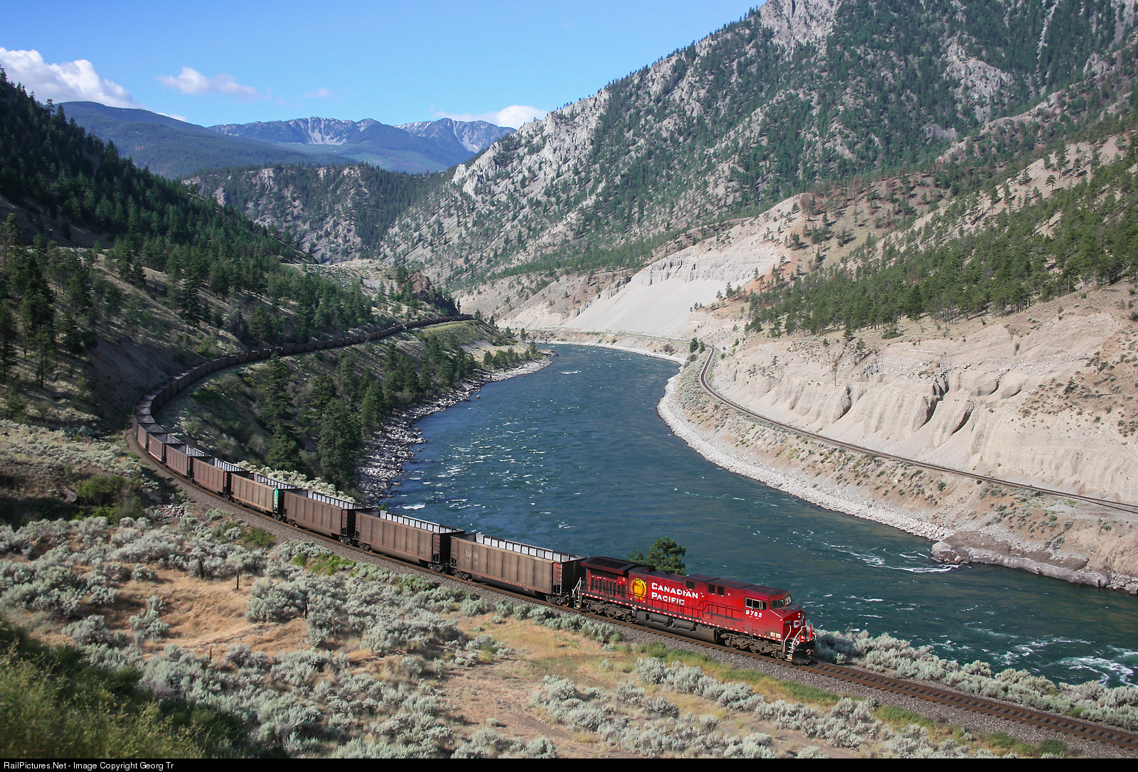 | Empty eastbound coal train of Canadian Pacific is rolling along the Thompson river east of Lytton, with AC44CW # 9782. In the rear of the long train was AC44CW # 9623, running radio controlled (distributed power). |