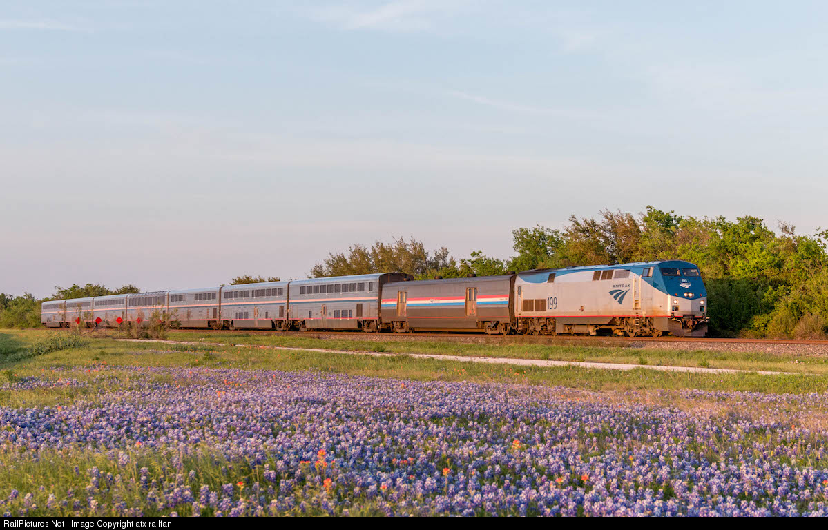 The Texas Eagle, running over an hour late, speeds past a field of bluebonnets in the unincorporated town of McNeil, Texas on the last day of March in a shot that's hard to get due to wildflowers, train schedules, and Daylight Savings not lining up well.