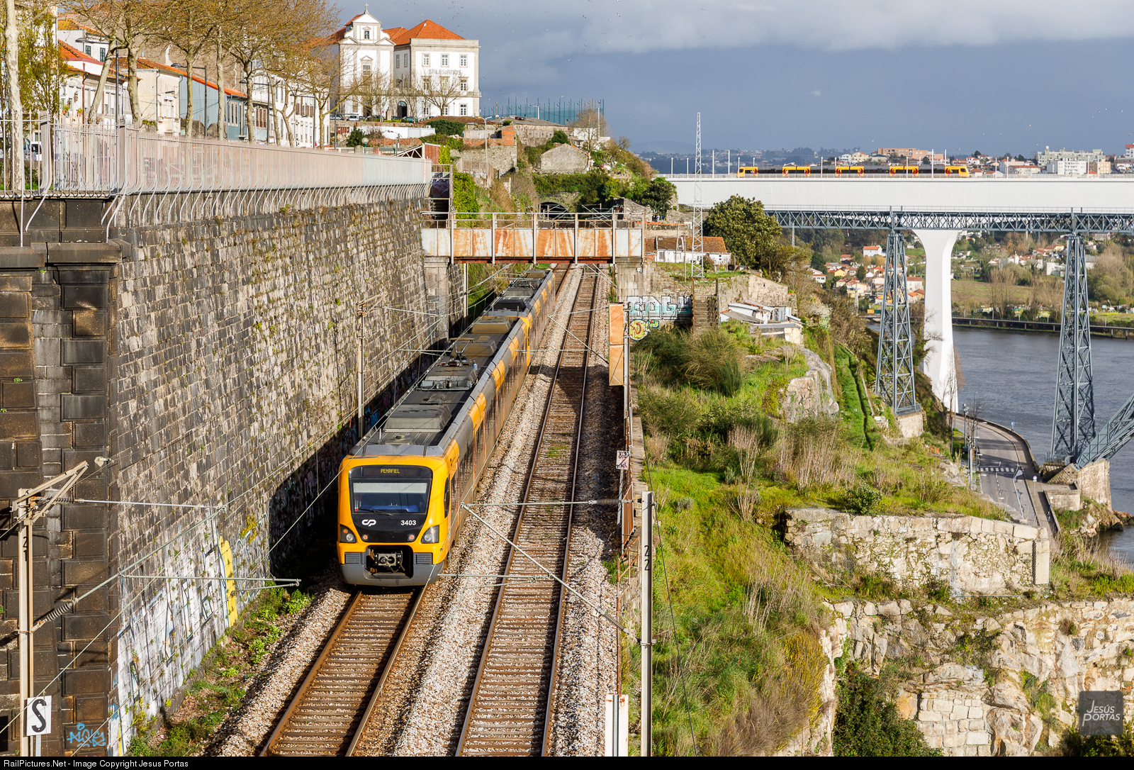 3400 EMU Suburban train is bound for Penafiel while in the background, another 3400 is crossing São João viaduct.