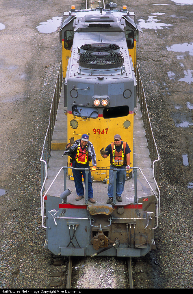 Friendly waves A couple of friendly switchmen offer a wave from the rear of Union Pacific EMD SD40-2 No. 9947 while making a move in the yard at Green River, Wyoming, on September 15, 2006. The former Missouri Pacific locomotive is in need of some tender loving care and some new paint, but still performs well in its radio-controlled job of switching cars in a busy yard.