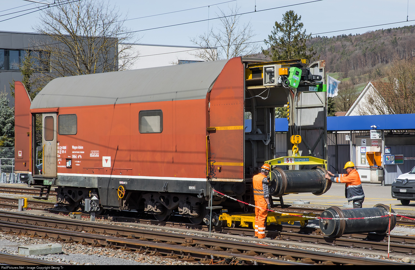 Calibration car (scale test car) Xas # 80 85 98-22 101-4 (home base Yverdon, built in 1978) at Weinfelden. This special car is used for calibrating the weighbridges at railway stations. Several weights of 5 ton each can be unloaded to the track and then rolled to the weighbridges for exact calibration. The car has 5 weights of 5 ton each and 2 of 2 ton each on board. The SBB infrastructure division ownes two of this calibration cars.