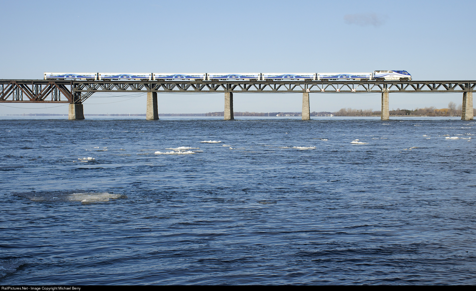 RTM 82 glides over the St. Lawrence River as it approaches the island of Montreal, with AMT 1329 leading six cars at the end of the morning rush hour.