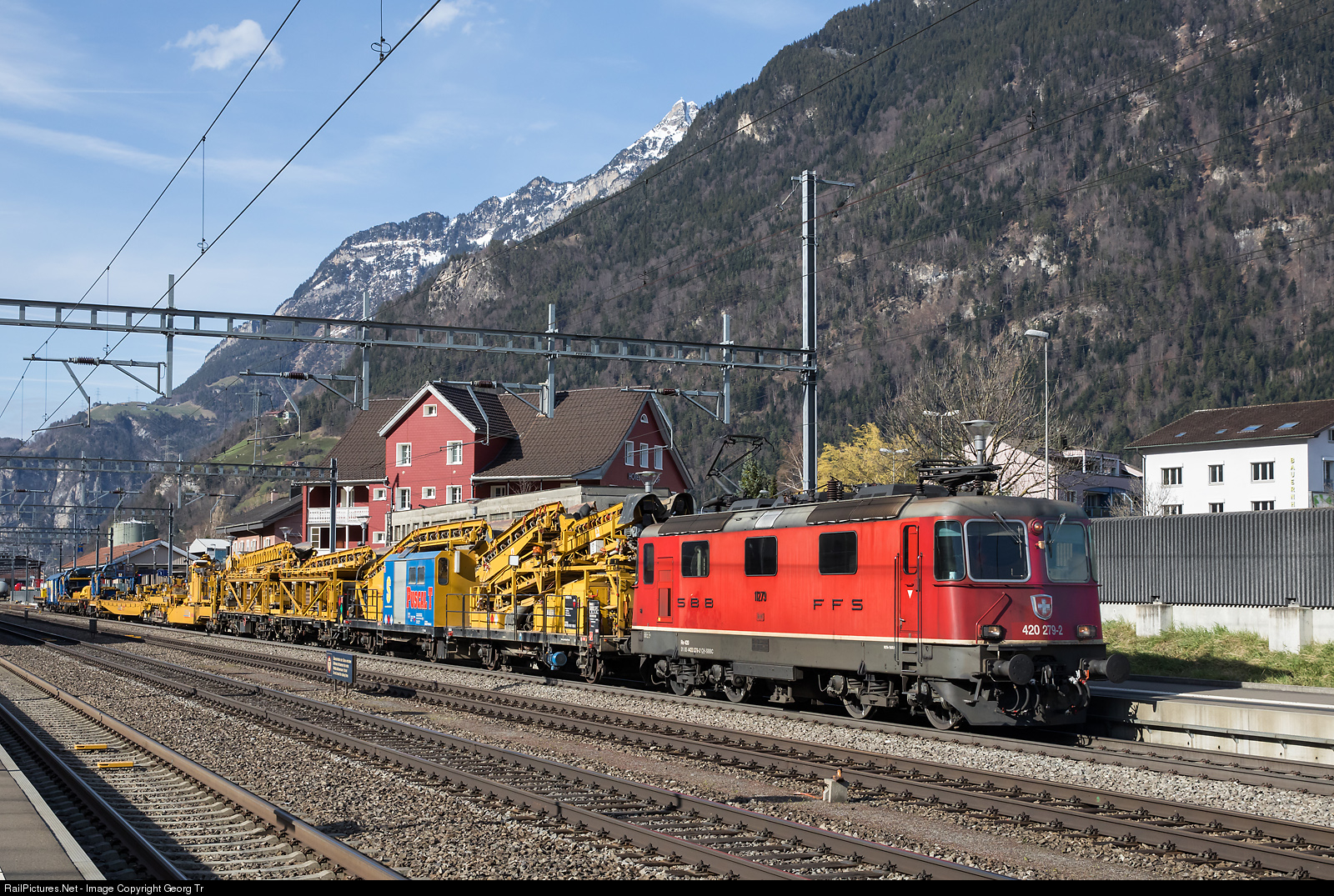 | Re 420 # 279 is pulling the track rebuilding train "Puscal T" of the Scheuchzer company from Oberburg via the Gotthard to Chiasso, passing Altdorf. |