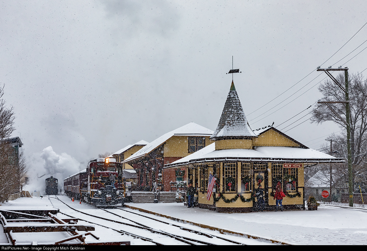 A Winter snow storm envelops the boarding area at the New Hope & Ivyland railroad as passengers board an early morning excursion led by line's handsomely painted EMD GP30 diesel. In the background, 2-8-0 No. 40 takes on water in preparation for the following run. The tourist line has recently begun this new practice of alternating runs between diesel and steam powered trains. To the right, is the immaculately restored former Reading depot which was originally located about 100 feet of its location today. Both the station and the freight house behind it were built in 1891.
