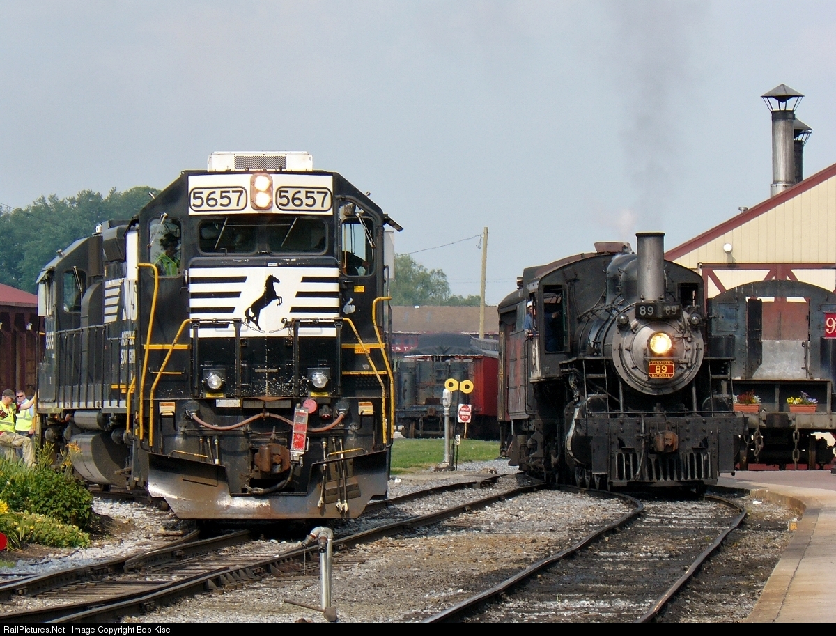 | A bit unusual to see regular NS local freight power in Strasburg, but the 5657 and 5655 have come up from Leaman Place Junction and are pulling into the yard siding to wait for the 4:00 p.m. train led by No. 89 to discharge its passengers. After 89 gets out of the way, the ex-PC and LV Geeps will retrieve the NS Exhibit Train at the museum across the street for the run back to Leaman Place. |