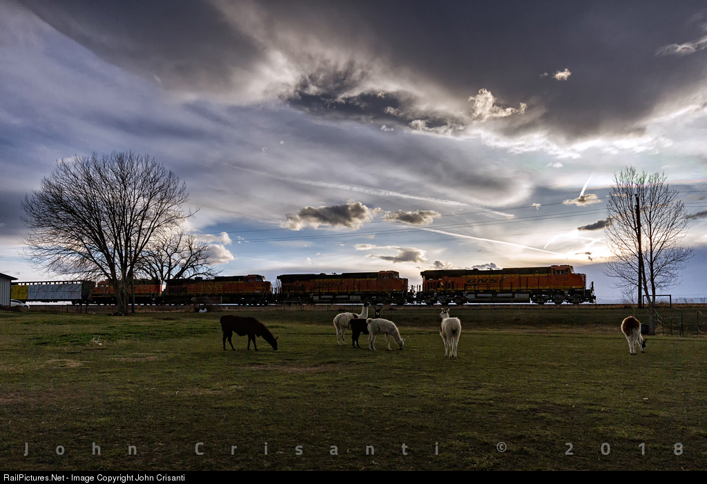 A group of llamas go about their own business as BNSF ES44C4 No. 4239 leads a northbound manifest down Berthoud Hill near Berthoud, Colorado on April 4, 2018.