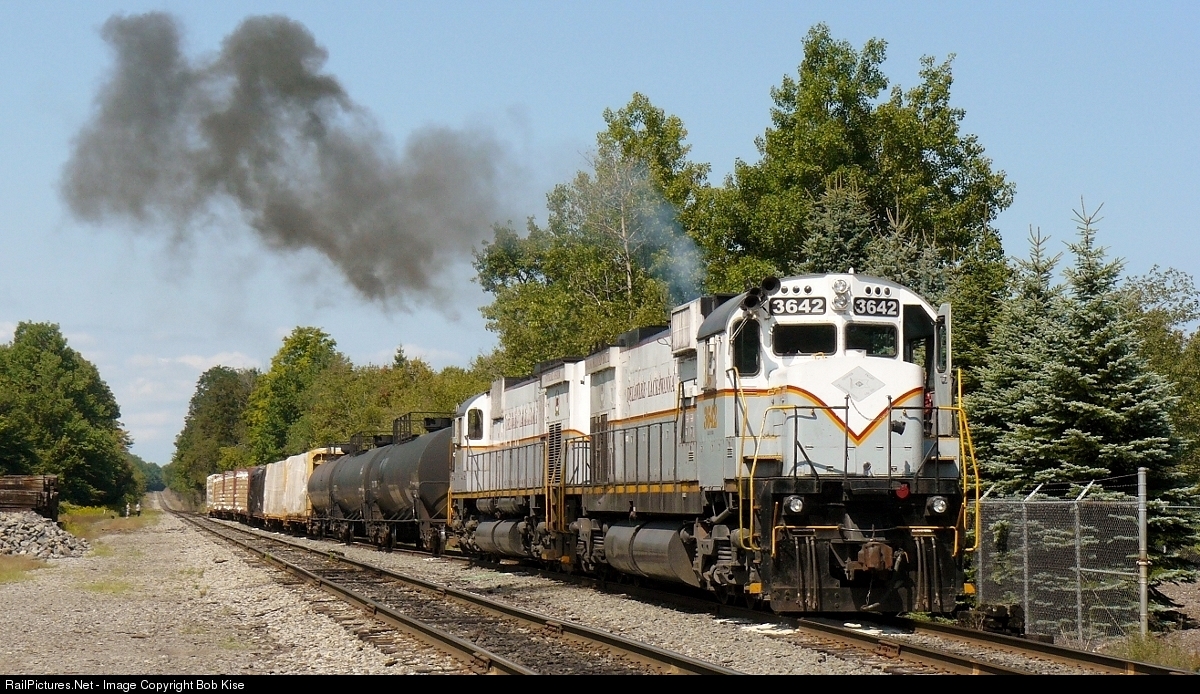 The Delaware-Lackawanna's big Century 636, at the moment of startup, emanating a typical Alco-like burst of thick, black smoke. The 3642 was built in April of 1968 as the Penn Central No. 6342.