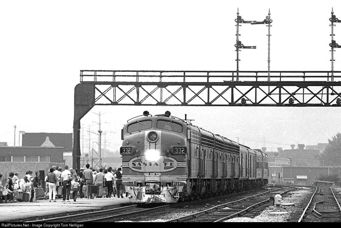 An impending thunderstorm has darkened a hot August evening as Santa Fe train 17, the westbound Super Chief, glides into Joliet Union Station past waiting passengers. With a five-unit lashup of F7s and F7Bs up front, the Santa Fe's premier train is 38 miles into its 2222-mile trip from Chicago to Los Angeles.