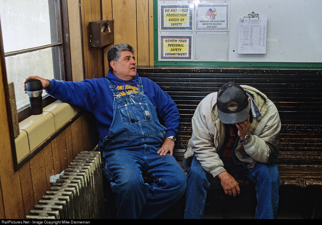When the days are short and that 7:00 a.m. call time gets you up in complete darkness, its only natural to want to either rub the sleep from your eyes or drink hot coffee from that favorite mug as Machinist Tony Bueno and Engineer Mel Baughman do here inside the Helper depot on December 3, 2004. Soon, Tony will head to the enginehouse to ready the power, and Mel will climb aboard the Tunnel Motors and begin switching the cars for the LJP45 “dirt train” local for the trip to East Carbon, Utah.