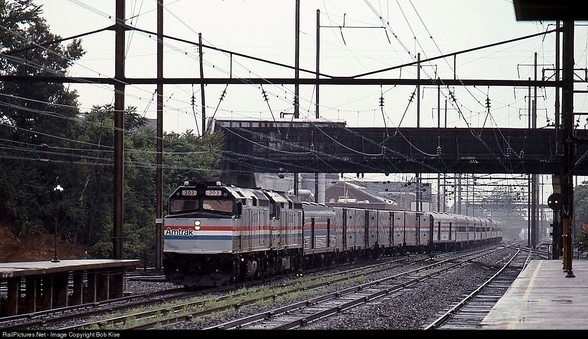 A late Claytor-era eastbound Broadway Limited is switching onto the platform track at Lancaster. A lot has changed here in 25+ years; the two center "mainline" tracks are gone, the iron bridge has been replaced, and the Armstrong Floor Co. industrial area behind the rear of the train to the left has been leveled. My late grandfather worked many a double-shift at Armstrong, before he retired in 1978.