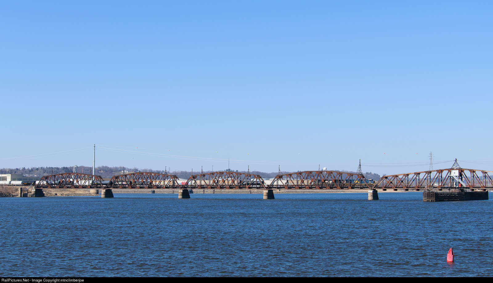 CSX and NS power leads CN 338, a manifest freight, as they take head room on the bridge over the Mississippi River in Dubuque in order to build their train after switching the yard.