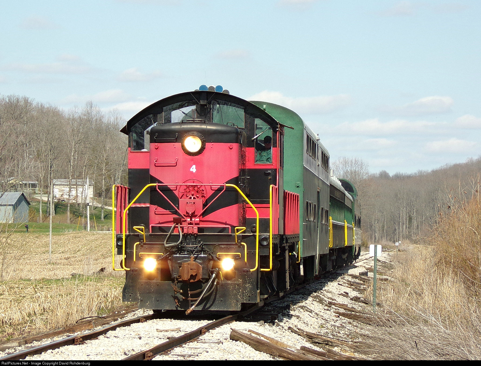 The French Lick Scenic Railway's restored AW&W Alco RS-1 number 4 leads the FLSR passenger train through an open valley approaching the station at Gradman on a beautiful Spring afternoon.