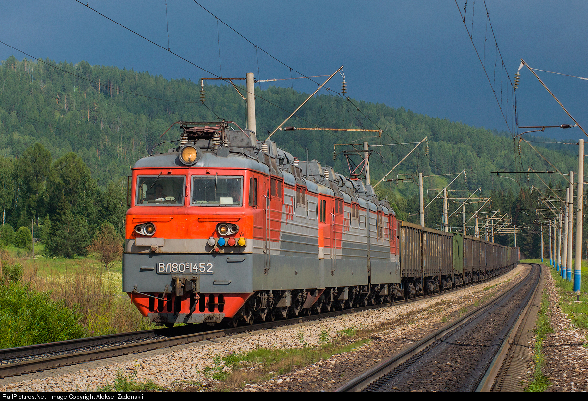 VL80S-1452 electric 25 kV AC locomotive (max power - 6520 kW (9780 kW in 3 sections), max speed - 100 km/h) heading freight train under a stormy sky. VL80S is the most numerous electric locomotive in the world. In total there were produced 2746 two-sectional units of VL80S, most of which are now in operation. VL80S series were manufactured by Novocherkassk Electric Locomotive Works between 1979 and 1995 and now VL80S series are in operation on the railways of Russia, Belarus, Kazakhstan, Ukraine and Uzbekistan.