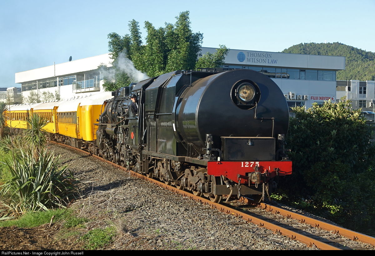 | 1275 was built by North British, Glasgow and was in service from 1952 to 1967. After restoration 1275 returned to main line in 2004. The train consisting of rolling stock based at Glenbrook Vintage Railway participated in fundraising trips from Whangarei to Portland and Kauri. This last train of the day was a special VIP train as part of rally supporting the upgrading of the line and a connection to the new port at Marsden Point. Passenger trains have not been allowed on this section to Kauri for nearly 20 years and a 25 Km/h speed limit applied. The train is approaching downtown running tender first from Kauri. |