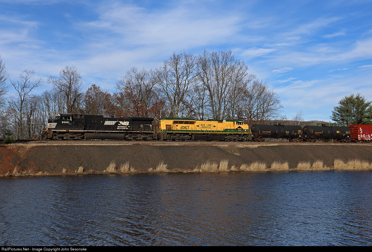 The Reading heritage is on the return trip of it's second visit to the former D&H. In the Fall of 2017 it made 2 roundtrips on NS mixed freights 14R-11R. The Reading is seen trailing on 11R as it passes the lake between Schenectady and Oneonta. 11R originates on the Pan Am at East Deerfield, MA and enters the NS at MP 485 in Schenectady, NY, continuing to Binghamton.