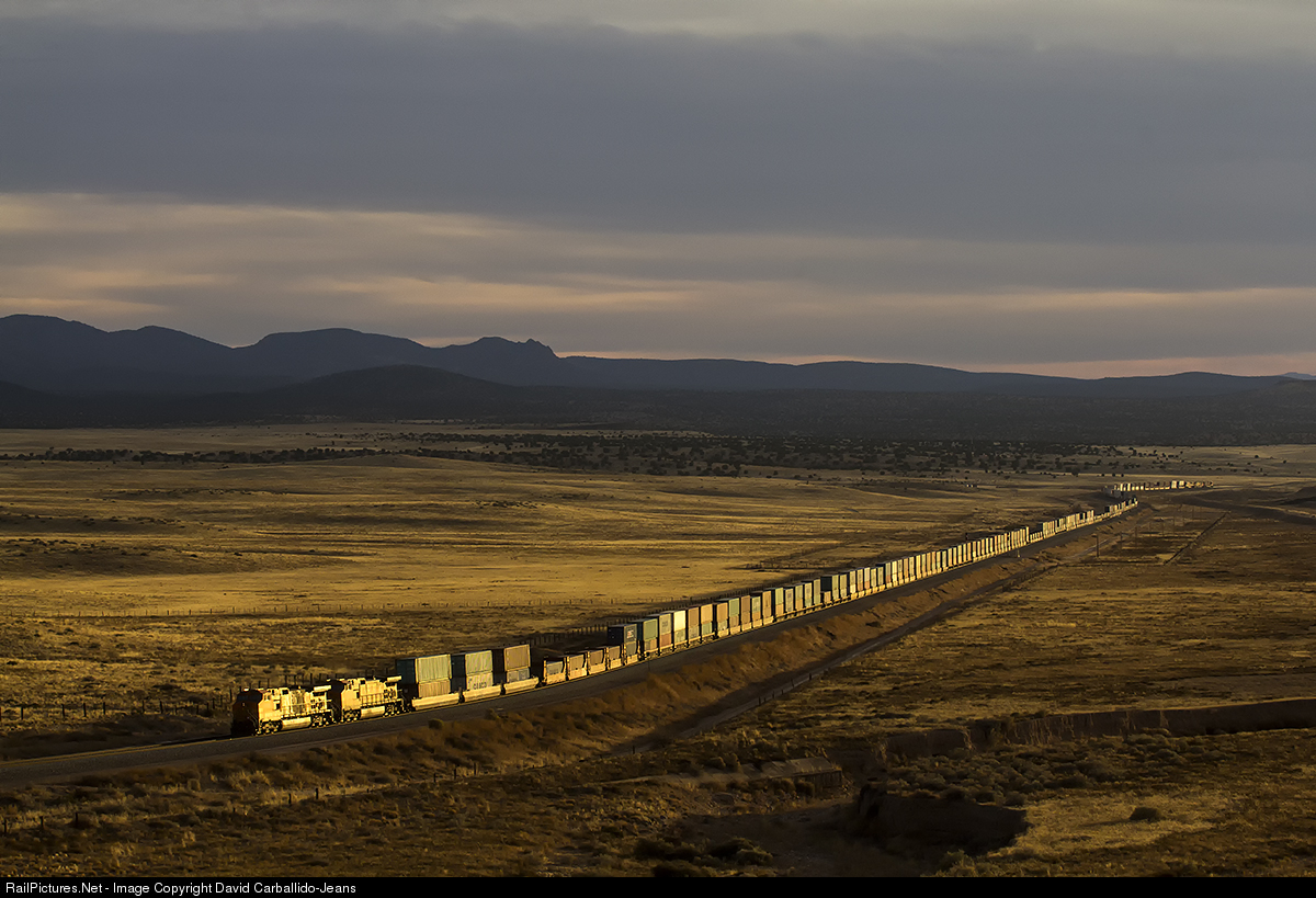 | A pair of GE motors help control the tail end of a heavy international intermodal train across the open range of northern Arizona, near the Hualapai Nation Reservation, as the setting sun dips behind the Cottonwood Mountains. |