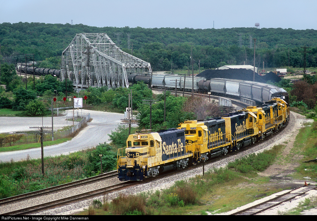 A westbound Santa Fe freight rumbles into Lemont, Illinois, crossing the bridge over the Chicago Sanitary and Ship Canal on September 2, 1990. Leading the train is venerable EMD GP7u No. 2149, mated to a GP30, a GP39-2, another GP30, a GP20 and another GP7u.