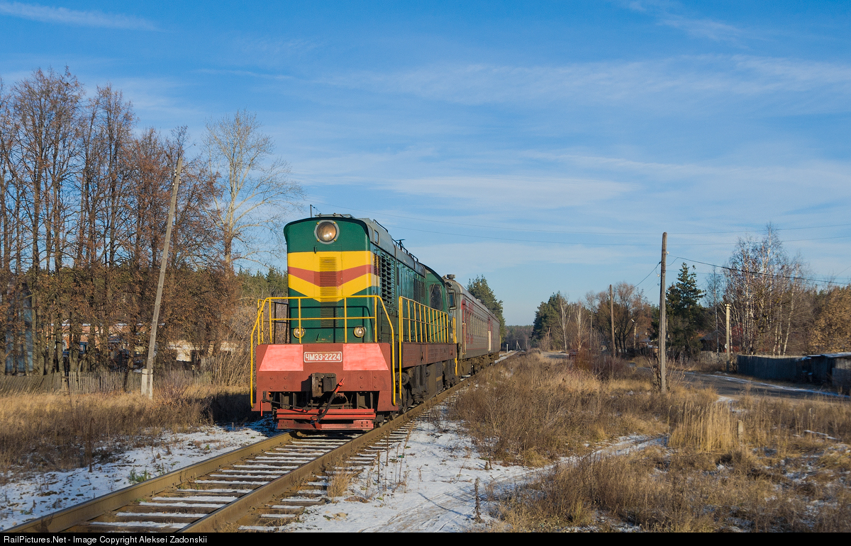 | ChME3-2224 diesel shunter (max power - 1350 hp, max speed - 95 km/h) heading local train from Vladimir to Tumskaya. ChME3* series were produced between 1963 and 1994by CKD Praha (former Czechoslovakia) for Soviet and post-soviet railways. In total there were produced 7459 units of different modifications of ChME3*. |